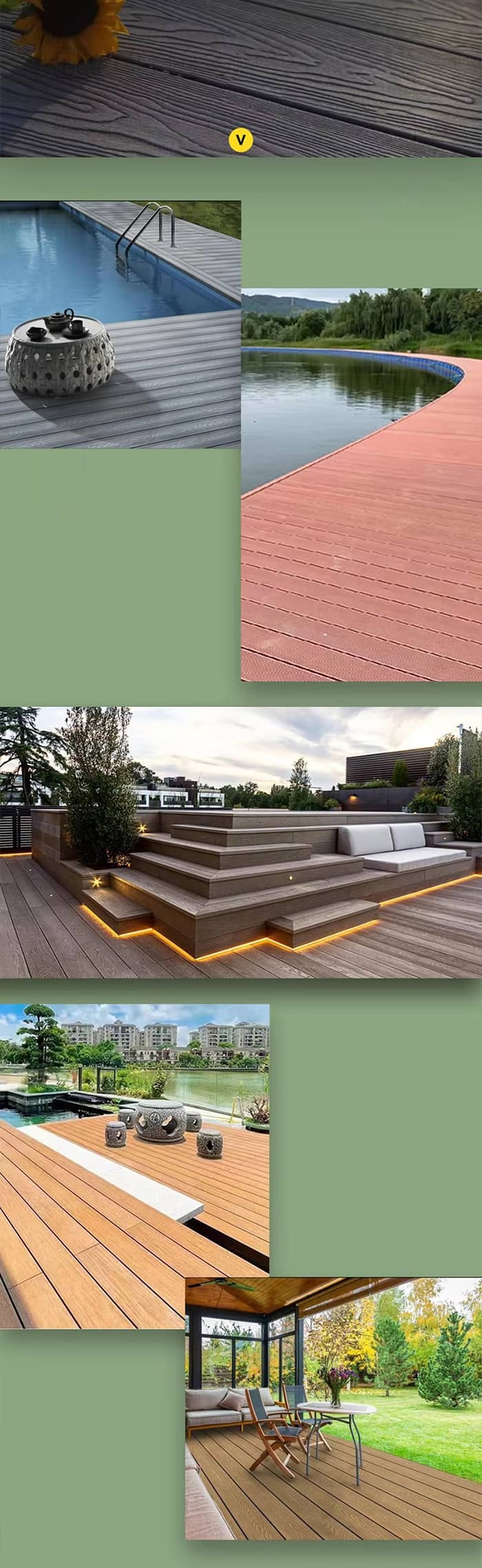 Külső környezet: Például teraszok, teraszok, kerti utak, kereskedelmi sétálóutcák stb., erős időjárásállósággal, rovarellenes, kültéri használatra alkalmasak